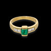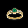 Anello a fascia sottile realizzato in oro giallo 18kt ed impreziosito sul frontale da smeraldo taglio quadrato e 4 diamanti taglio baguette disposti a coppia ai lati dello smeraldo.
