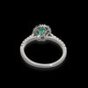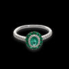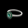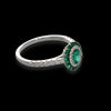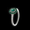 Anello rigenerato in oro bianco 18kt ed impreziosito da uno smeraldo centrale taglio ovale circondato da due file di pietre preziose.