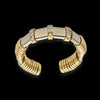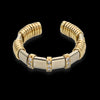 Anello rigido con apertura sul retro caratterizzato da rondelle in oro giallo 18kt che si alternano a elementi rettangoli in oro bianco.