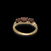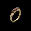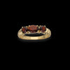 Anello vintage in oro giallo 18kt impreziosito da 3 pietre granate, più grande la centrale e leggermente più piccole le laterali, incastonate in 4 griffe.