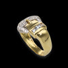 Anello in oro giallo 18kt con una graziosa chiusura a fibbia impreziosita da diamanti e tre quadrati di acquamarina.