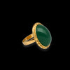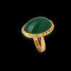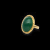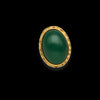 Anello in oro giallo 18kt con maestosa giada verde fondo di bottiglia taglio ovale cabochon, incastonata in una cornice intagliata sempre in oro giallo.