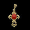 Meraviglioso pendente a forma di croce realizzato in oro giallo 18 kt con una lavorazione merlettata. Al centro un incantevole corallo rosso taglio ovale