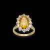 Anello in oro giallo 18kt dalla classica montatura a fiore impreziosita da petali di pietre sintetiche bianche e fulcro di vetro giallo.