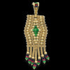 Pendente SunDay con sfere satinate alternate a catena con rombo centrale di radici di smeraldi con sette catene pendenti che terminano con tre sfere colorate di radici di rubini zaffiri e smeraldi.