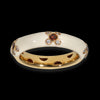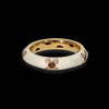 Anello fede in oro giallo 18kt smaltato bianco con disegno di tre fiori realizzati con rubino centrale e petali di diamanti bianchi.