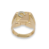 Realizzato in oro giallo 18kt lucido, l'anello presenta una struttura solida e maschile, con linee pulite che valorizzano la forma centrale dell'anello. La testa quadrata si divide in due triangoli lavorati in maniera differente. Un triangolo è realizzato in finitura liscia, mentre l'altro presenta una lavorazione intagliata a rombi su cui spicca la staffa di cavallo in oro bianco liscio.