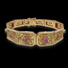 Tutto il bracciale è formato da una serie di maglie rettangolari irregolari che si rimpiccioliscono man mano che ci si avvicina alla chiusura, collegate l'una all'altra e interamente abbellite da una serie di decorazioni su cui spiccano due pietre di tormalina rosa incastonate in 4 griffe. Sui rettangoli frontali invece le pietre sono 4.