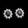 Orecchini in oro bianco 18 carati realizzati con la classica montatura a fiore impreziosita da zaffiro centrale taglio ovale incorniciato da 10 diamanti bianchi taglio brillante.