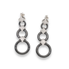 Orecchini in oro bianco 18kt impreziositi da tre cerchi pendenti di grandezza diversa realizzati in ceramica nera e tenuti insieme da croci tempestate da pavè di diamanti bianchi.