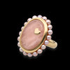 Anello in oro giallo 18 carati con al centro un imponente quarzo rosa taglio ovale circondato da perline rosè ed impreziosito da un piccolo cuore in oro giallo fuso sopra.