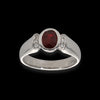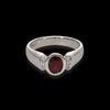 Anello in oro bianco 18kt con rubino centrale taglio ovale e 3 diamanti bianchi ai lati.