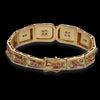 Tutto il bracciale è formato da una serie di maglie rettangolari irregolari che si rimpiccioliscono man mano che ci si avvicina alla chiusura, collegate l'una all'altra e interamente abbellite da una serie di decorazioni su cui spiccano due pietre di tormalina rosa incastonate in 4 griffe. Sui rettangoli frontali invece le pietre sono 4.